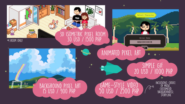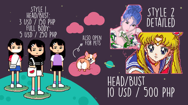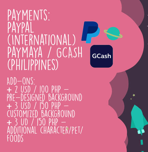 NO RUSH COMMISSIONS. Please understand that I can only do the commissions on WEEKENDS so please give me 1-2 weeks for png/gifs & 3-4 weeks for animations (video style).Please provide a clear reference photo/video and details ㅡ size (max. of 3000x3000 px), colors, theme, music, etc.Plain background is free. For pre-designed backgrounds, I will provide choices from my previous works.At least 50% downpayment for me to officially accept / start working on the commission, remaining 50% must be paid before I send the final work.Clients will be given 3 days (after official acceptance of commsion) for MAJOR revisions/changes. After three (3) days, no changes may be made. AFTER the work is DONE, clients will be given two (2) chances for MINOR revisions/changes.I have ALL RIGHTS on my commissions, I can post it on any social networking site and use it as a commission sample.I have the right to decline the commission for any reason.Any work is for PERSONAL USE ONLY. Client may NEVER claim the copyright for my work yet I am open if client has plans to make profit from it (must be thoroughly discussed between me & client).Please be nice to me! T_T